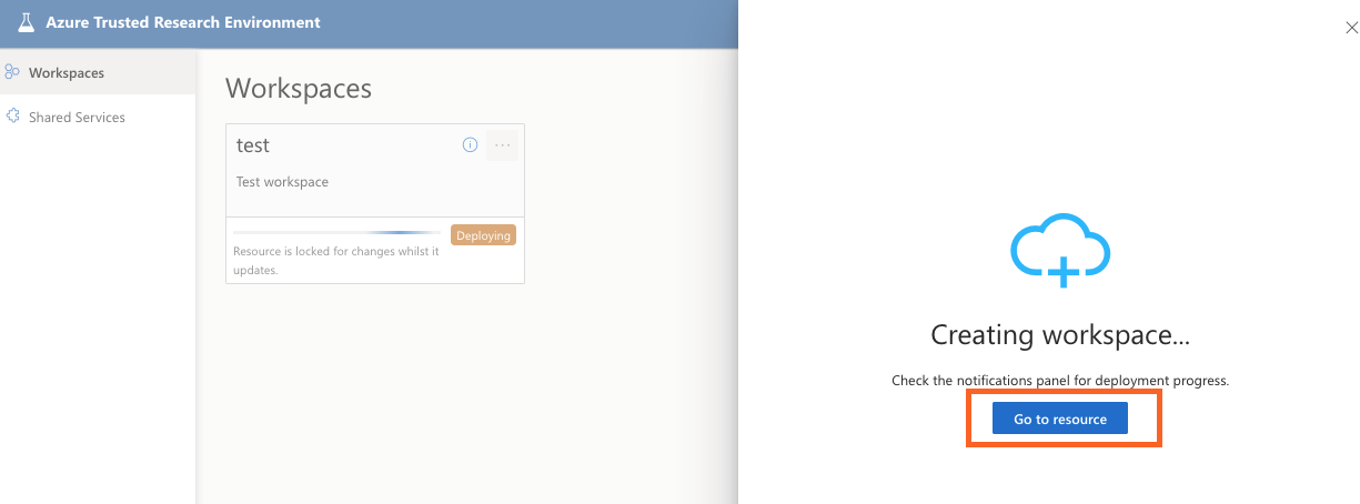 Workspace can be easily created via AzureTRE UI. Open a browser and navigate to: https://<TRE_ID>.<LOCATION>.cloudapp.azure.com/ (replace TRE_ID and LOCATION with values from previous steps). It will require you to log in, make sure you login with a user who is a TREAdmin.