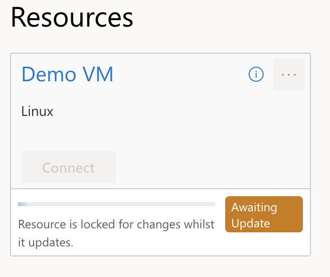 Whilst the VM is currently updating due to an invoked action it will display a message similar to the one below. This will occur any time a service or user resource is deployed, disabled, deleted etc.