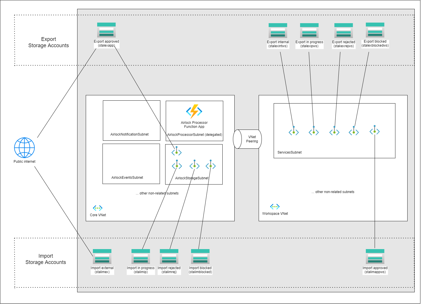 The Airlock feature is supported by infrastructure at the TRE and workspace level, containing a set of storage accounts. Each Airlock request will provision and use unique storage containers with the request id in its name.