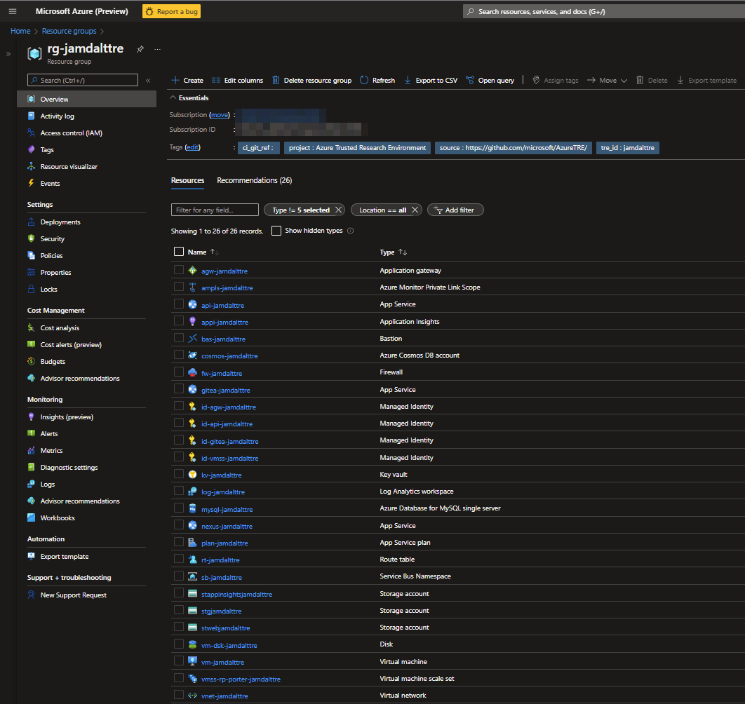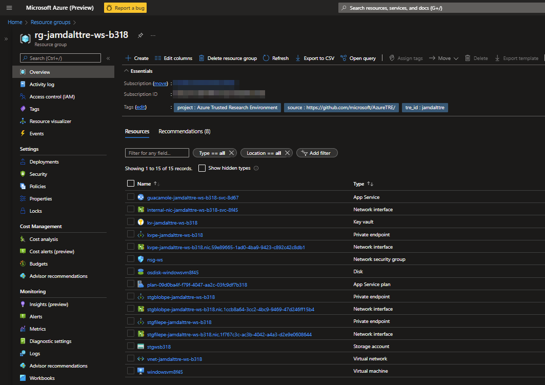 A TRE Workspace will be provisioned in a separate Resource Group along with its own resources. An example TRE Workspace is shown and described here.