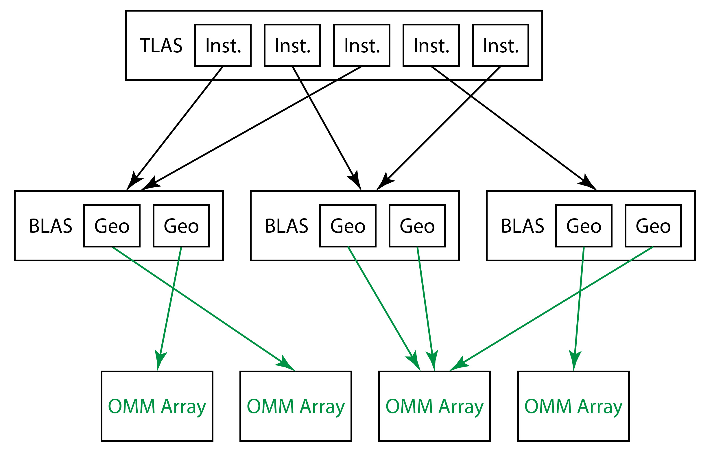The two level hierarchy for geometry lets applications strike a balance between intersection performance (maximized by using larger bottom-level acceleration structures) and flexibility (maximized by using more, smaller bottom-level acceleration structures and more instances in a top-level acceleration structure).