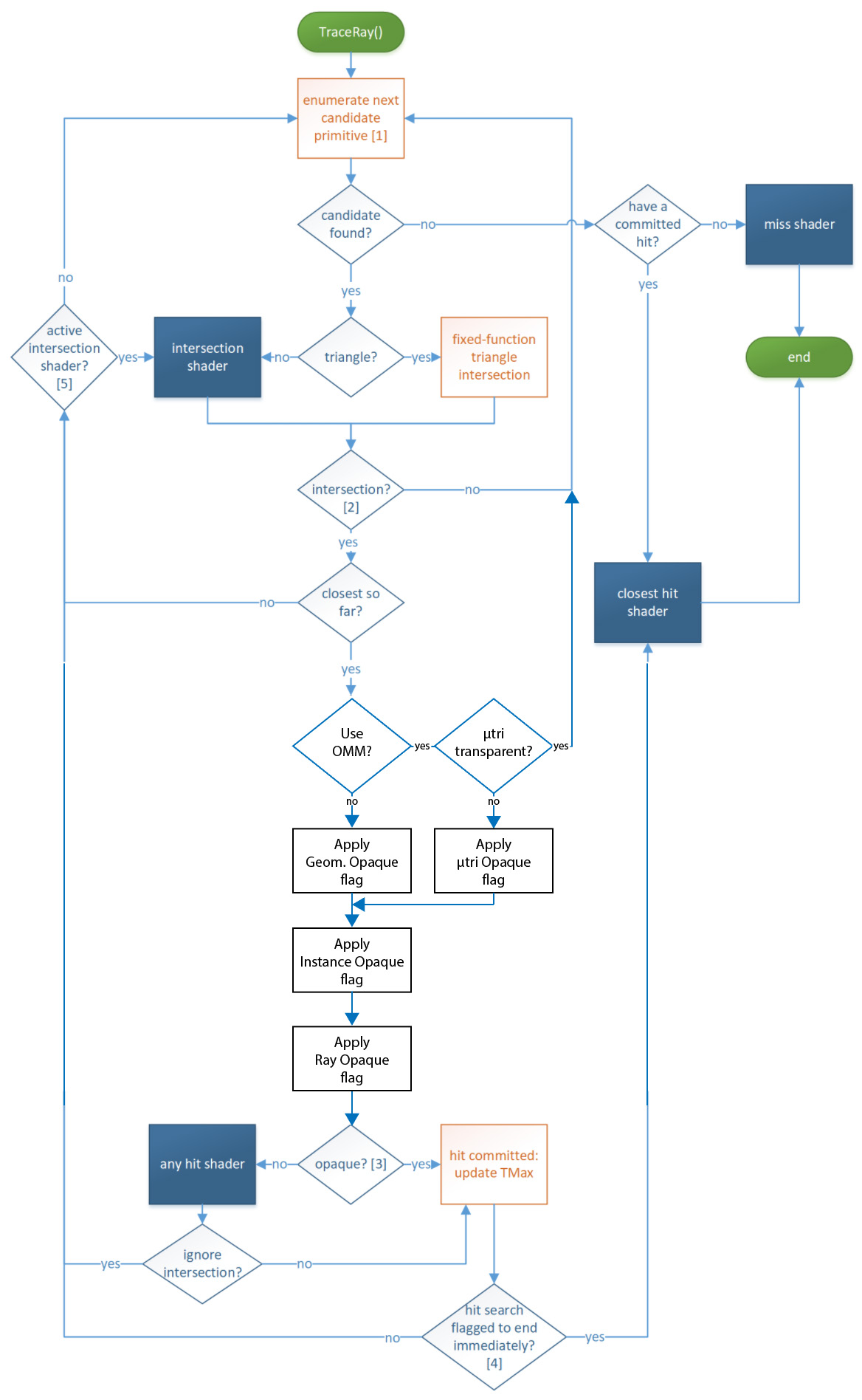 [1] This stage searches acceleration structures to enumerate primitives that may intersect the ray, conservatively: If a primitive is intersected by the ray and is within the current ray extents, it is guaranteed to be enumerated eventually. If a primitive is not intersected by the ray or is outside the current ray extents, it may or may not be enumerated. Note that TMax is updated when a hit is committed (internal to the traversal, not visible to the application).