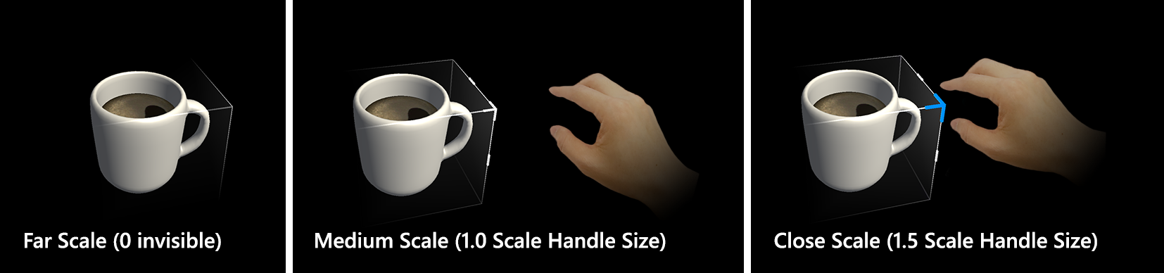 • Far Scale: Default scale value of the handle asset when the hands are out of range of the bounding box interaction (distance defined above by 'Handle Medium Proximity'. Use 0 to hide handle by default)