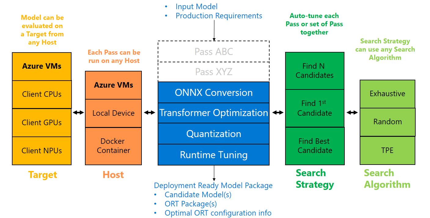 The workflow which is run by the Engine is composed of Passes that are executed in a specific order. Each Pass is responsible for performing a specific optimization on the model. Each Pass might have a set of parameters that can be tuned to achieve the best metrics, say accuracy and latency, that are evaluated by the respective Evaluator. The Engine employs a Search Strategy that uses a Search Algorithm to auto-tune each Pass one by one or set of Passes together.