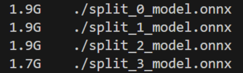 In this example, Olive split the model into four components each with size less than the max target memory of 2GB specified by the user.