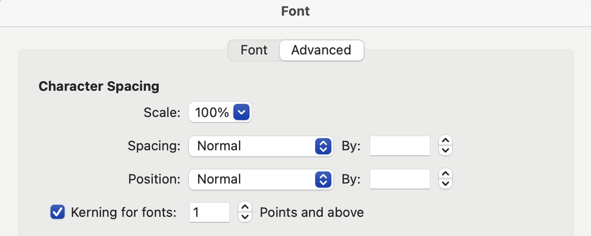 To ensure correct display of text in indigenous languages, kerning should not be considered optional and care should be taken to confirm that it is active in software. Notably, in previous versions of Microsoft Word, it is necessary to turn on kerning for selected text in the Font formatting dialogue: