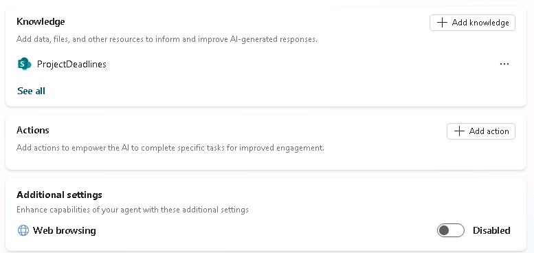 These sections also allow you to limit Copilot’s knowledge to specific sources, ensuring it uses only the selected information rather than all available knowledge.