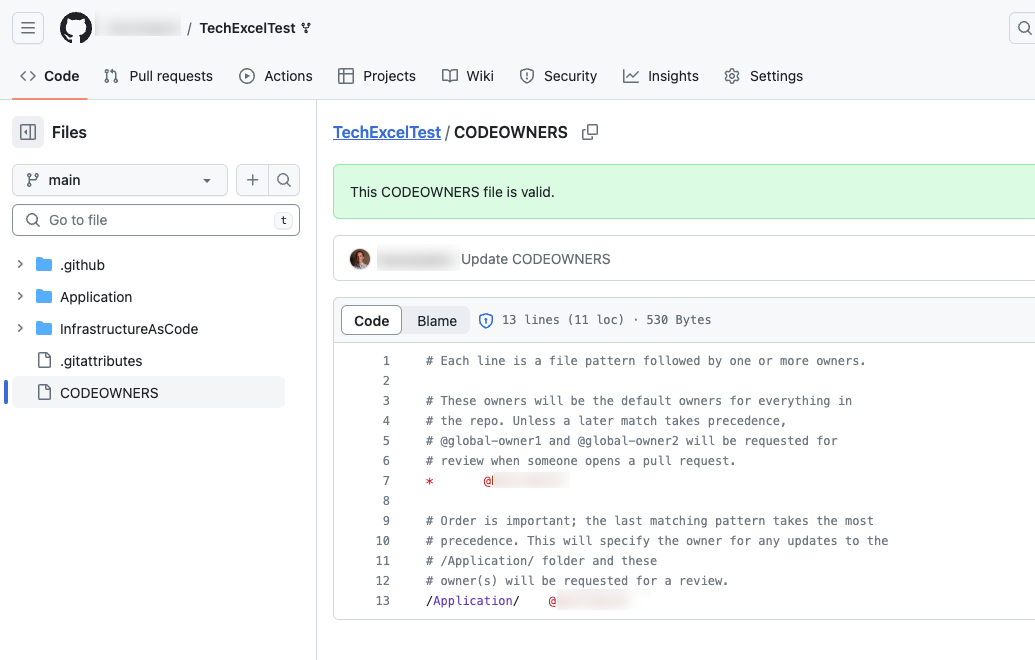 /Applicationdirectory. Your branch policy should require a review from the code owner. - Create and complete a Pull Request, merging your code change into the protected branch.