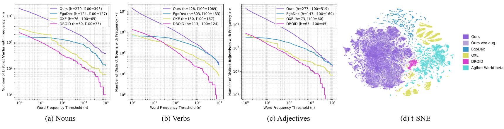 To investigate data diversity, we conduct a detailed analysis of the visual observations and language instructions in our hand V-L-A dataset. We compare the word frequency of language instructions across different datasets (including ours, Egodex, Agibot World beta, DROID, OXE ), as well as the diversity of DINO features of images.