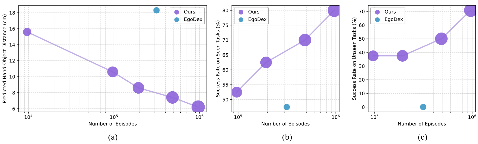 We investigate how the scale of pretraining data influences human hand action prediction performance and the performance on real robot. We compare the model trained on the full pretrained dataset with those trained on sub-sampled datasets at different ratios.