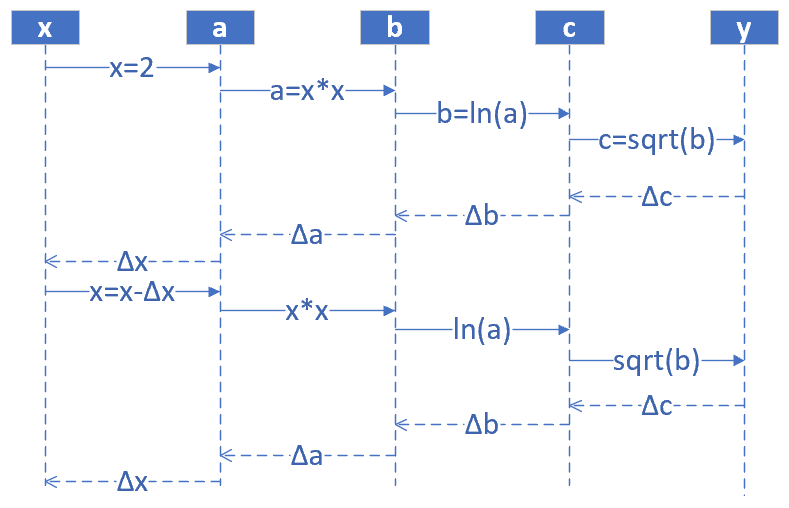 因此得到如下一组公式,可以把最后一层 \Delta c 的误差一直反向传播给最前面的 \Delta x,从而更新 x 值: