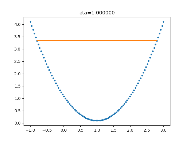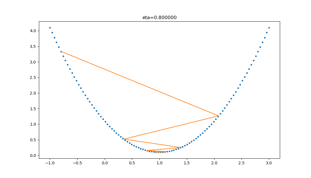 学习率太大,迭代的情况很糟糕,在一条水平线上跳来跳去,永远也不能下降。 |