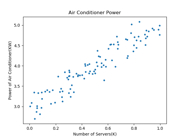 通过对上图的观察,我们可以判断它属于一个线性回归问题,而且是最简单的一元线性回归。于是,我们把热力学计算的问题转换成为了一个统计问题,因为实在是不能精确地计算出每块电路板或每台机器到底能产生多少热量。