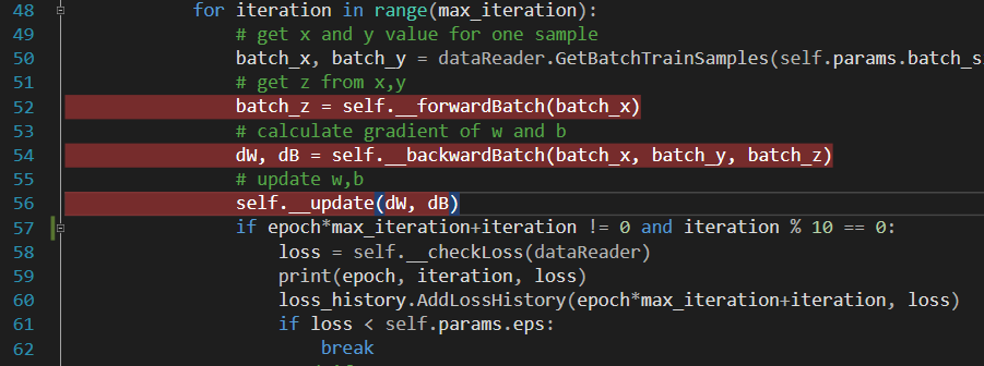 我们可以在NeuralNet.py文件中,在图5-3代码行上设置断点,跟踪一下训练过程,以便找到问题所在。