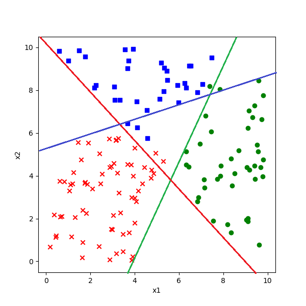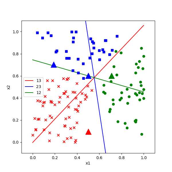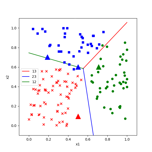 同理,用于分开红色点和其它两类的分割线是蓝色射线和绿色射线,用于分开绿色点和其它两类的分割线是红色射线和蓝色射线。