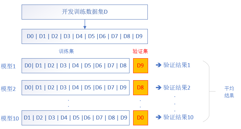 - 随机将训练数据分成K等份(通常建议 K=10),得到D_0,D_1,D_9;