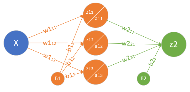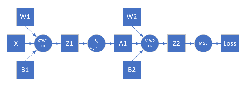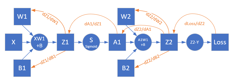 如果想计算W1和B1的反向误差,必须先得到Z1的反向误差,再向上追溯,可以看到Z1->A1->Z2->Loss这条线,Z1->A1是一个激活函数的运算,比较特殊,所以我们先看Loss->Z->A1如何解决。