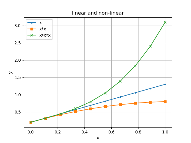 plt.legend([p1,p2,p3], ["x","x*x","x*x*x"])