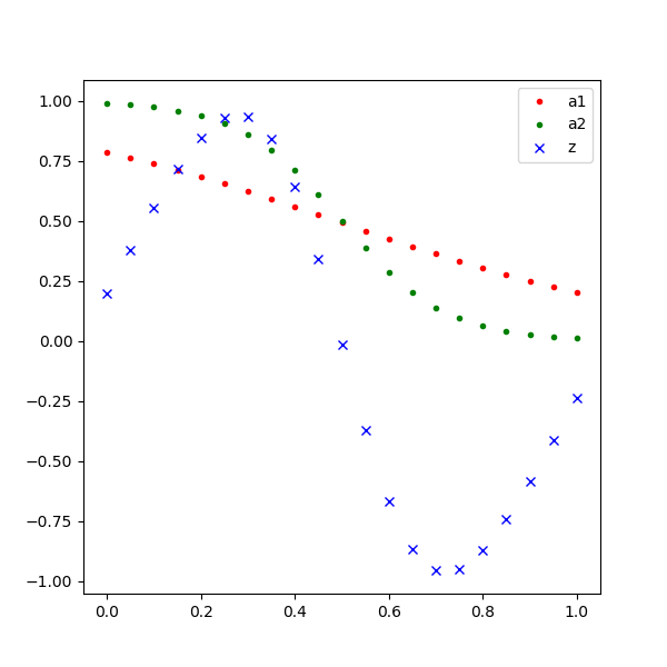 也就是说,相同x值的红点a1和绿点a2,经过公式6计算后得到蓝点z,而所有的蓝点就拟合出一条正弦曲线。