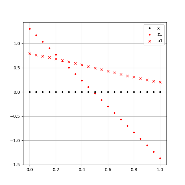 z1还是一条直线,但是经过激活函数后的a1已经不是一条直线了。上面这张图由于z1的跨度大,所以a1的曲线程度不容易看出来。