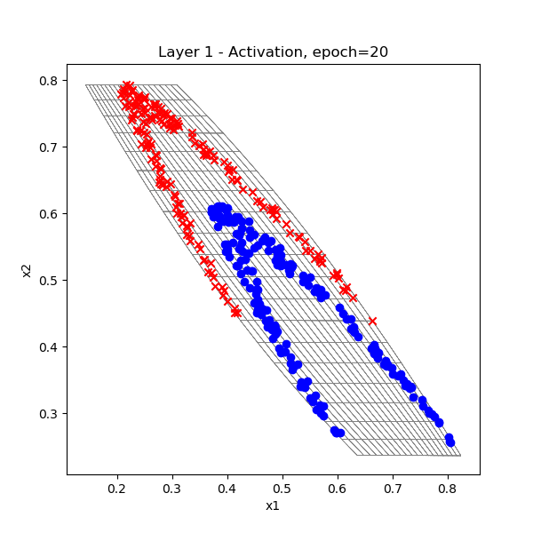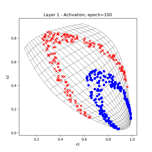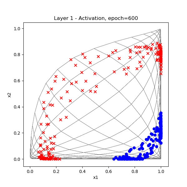 - 在激活函数计算中,由于激活函数的非线性,所以空间逐渐扭曲变形,使得红色样本点逐步向右下角移动,并变得稠密;而蓝色样本点逐步向左上方扩撒,相信它的极限一定是[0,1]空间的左边界和上边界;另外一个值得重点说明的就是,通过空间扭曲,红蓝两类之间可以用一条直线分割了!这是一件非常神奇的事情。