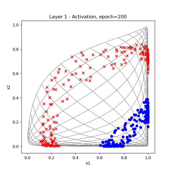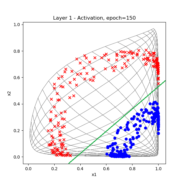 绘制经过神经网络第一层的线性计算即激活函数计算后,空间变换的结果。神经网络的第二层就是在第一层的空间变换的结果之上来完成分类任务的。
