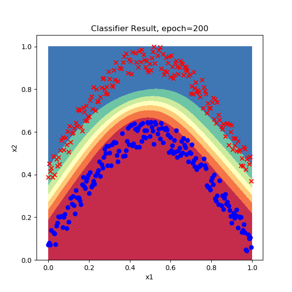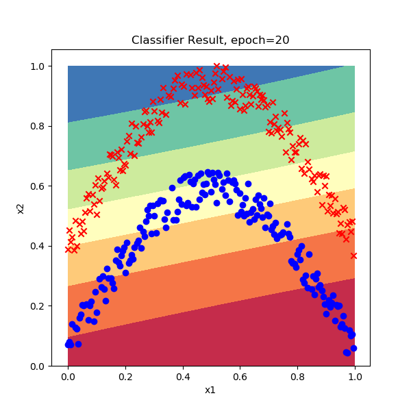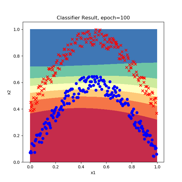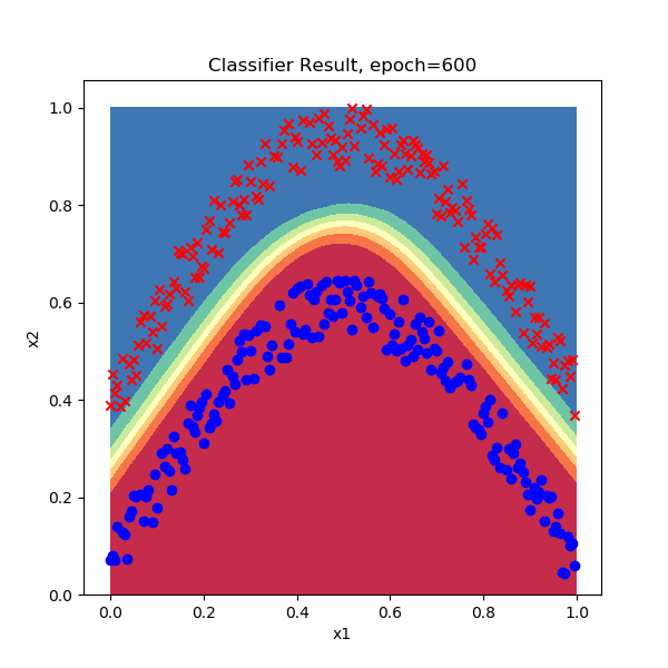 - 最后的分类结果,从毫无头绪到慢慢向上拱起,然后是宽而模糊的分类边界,最后形成非常锋利的边界。
