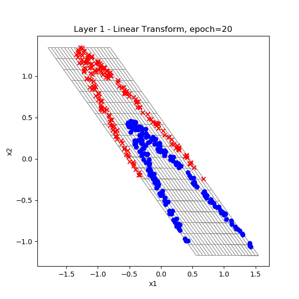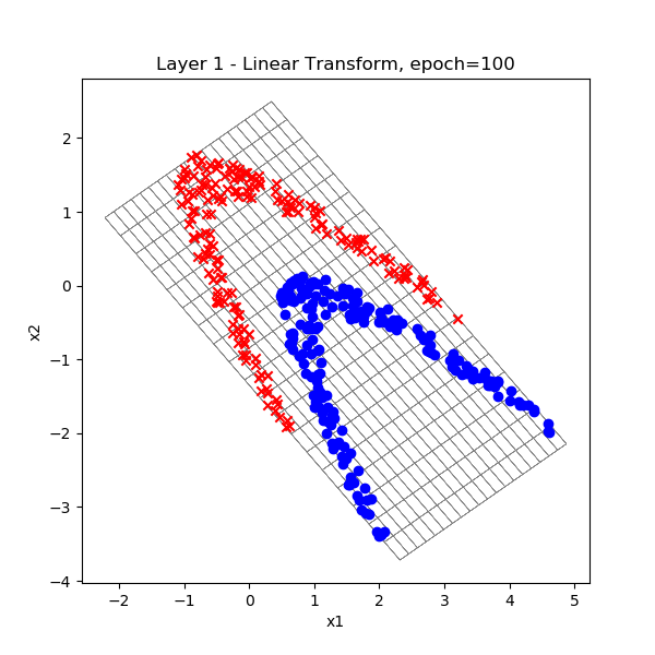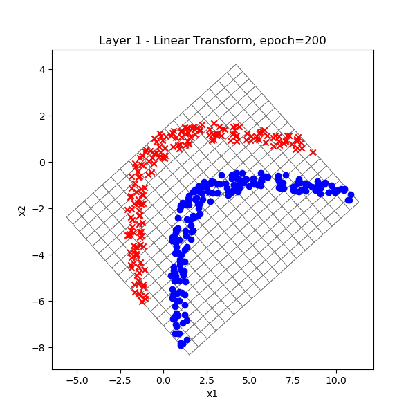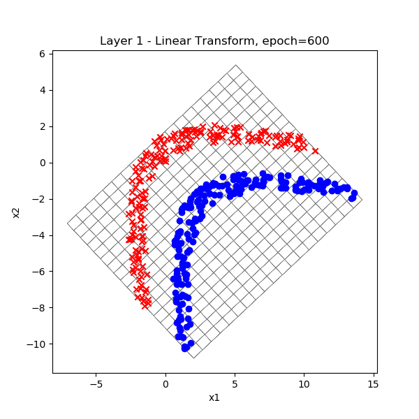 - 在第一层的线性变换中,原始样本被斜侧拉伸,角度渐渐左倾到40度,并且样本间距也逐渐拉大,原始样本归一化后在[0,1]之间,最后已经拉到了[-5,15]的范围。这种侧向拉伸实际上是为激活函数做准备。
