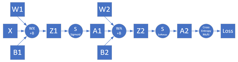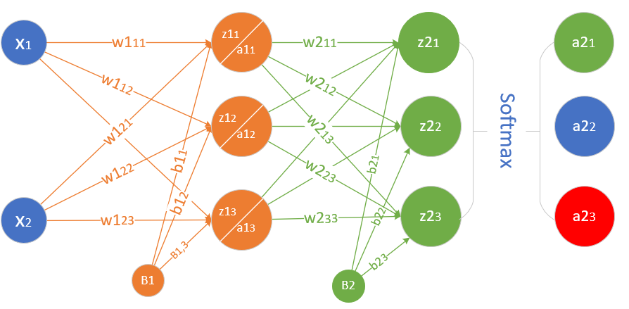 使用多分类交叉熵损失函数: $$ loss = -(y_1 \ln a2_1 + y_2 \ln a2_2 + y_3 \ln a2_3) $$ $$ J(w,b) = -\frac{1}{m} \sum^m_{i=1} \sum^n_{j=1} y_{ij} \ln (a2_{ij}) $$