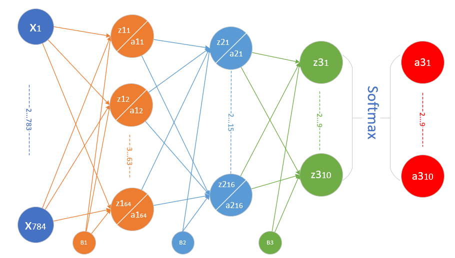 输出层10个神经元,再加上一个Softmax计算,最后有a1,a2,...a10共十个输出,分别代表0-9的10个数字。