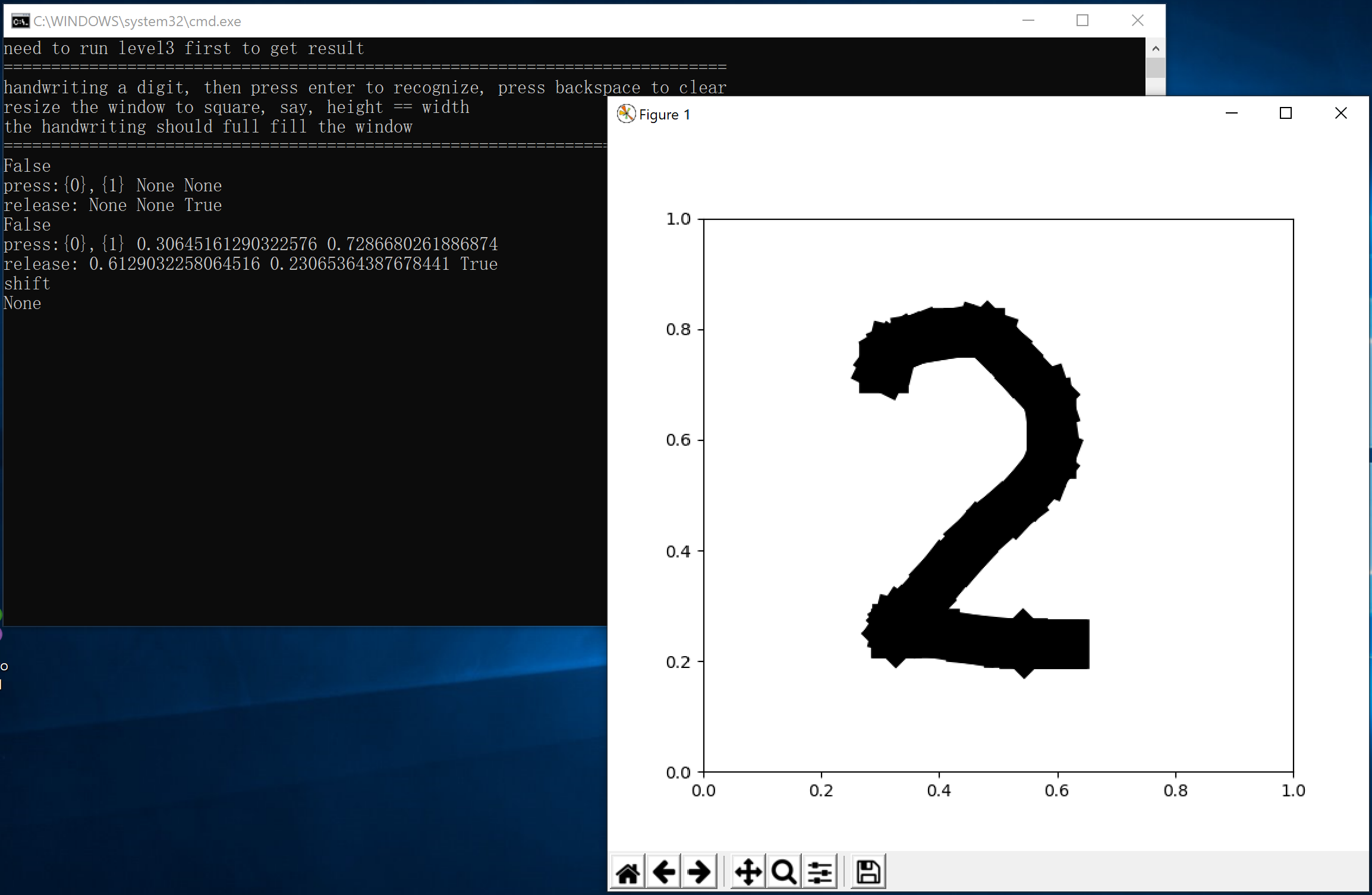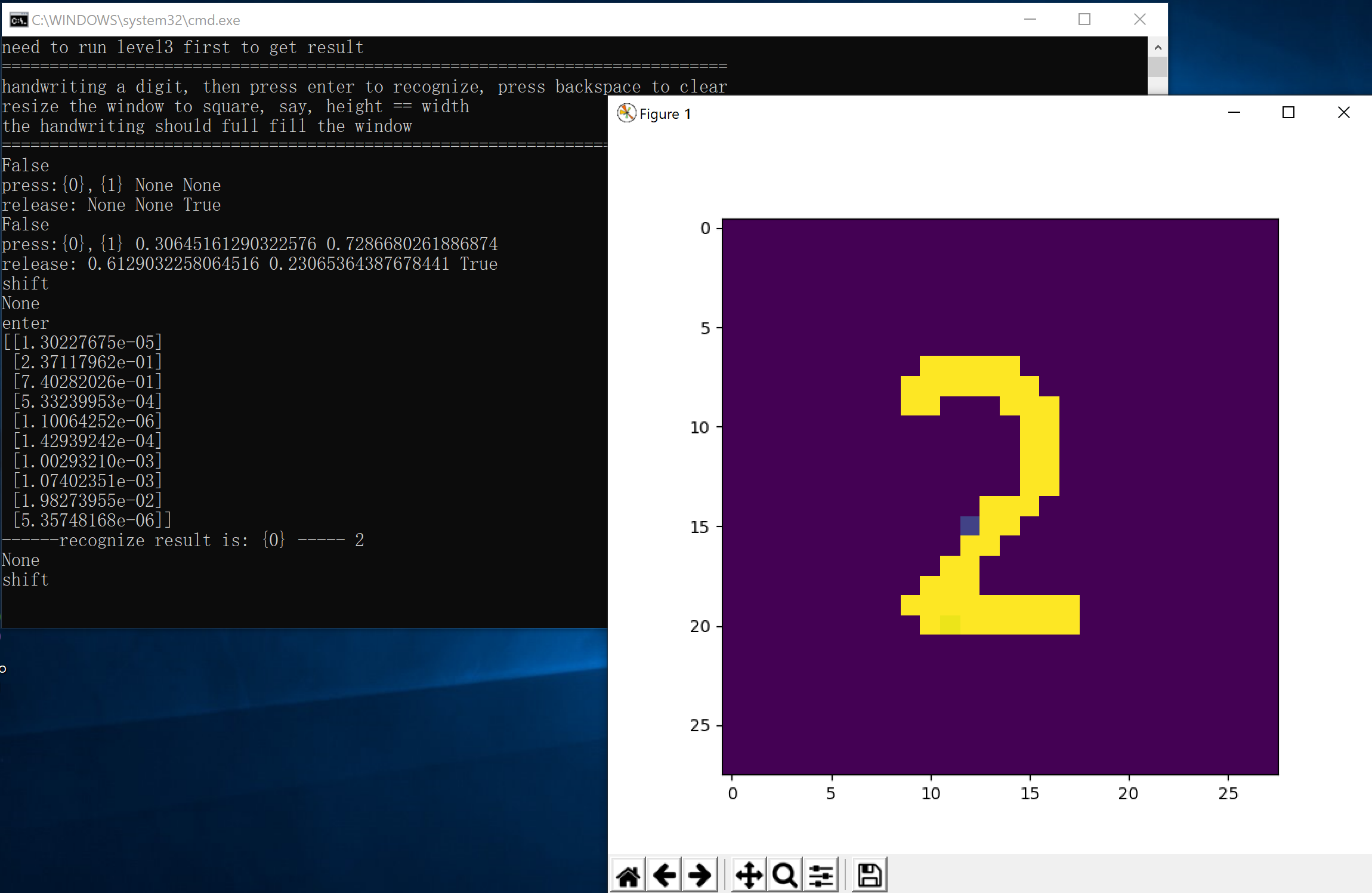 此时会看到图13-2中,左侧控制台窗口中会显示一些辅助信息,如鼠标按下和释放的坐标。写完后,按回车键,会触发数据处理和推理过程。数据处理过程如下: