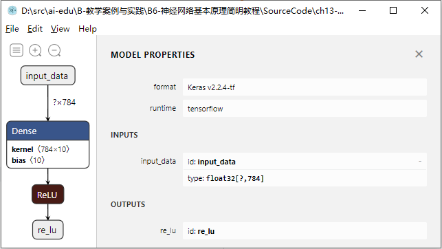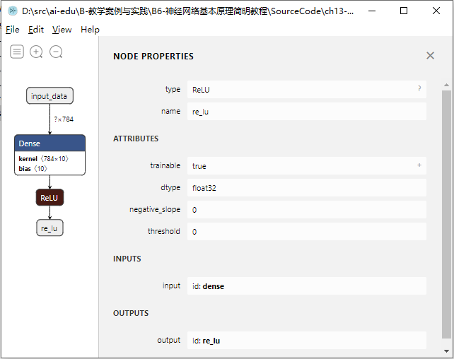 这里使用的网络非常简单,可以看到图13-5中一共有4个节点:输入节点、Dense层、ReLU层、输出节点,和我们代码中定义的一致。