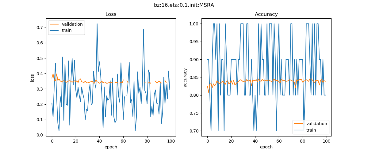 下图左边是损失函数图,右边是准确率图。忽略测试数据的波动,只看红色的验证集的趋势,损失函数值不断下降,准确率不断上升。