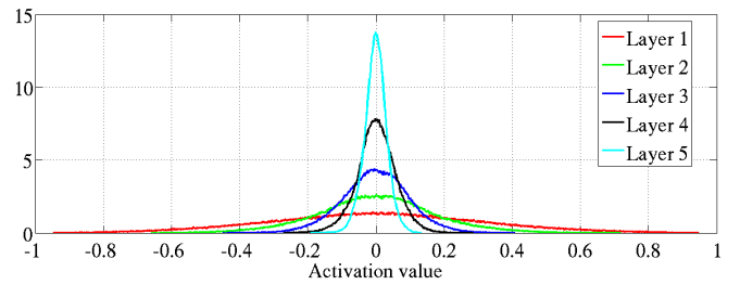 | 4 | 多层 | 随机初始化 | Sigmoid | 激活值分布成凹形,不利于反向传播 |