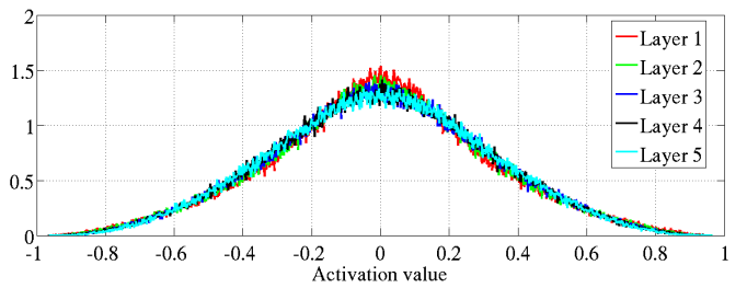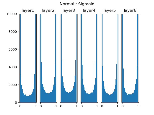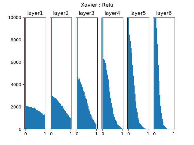 | 6 | 多层 | Xavier初始化 | ReLU | 激活值分布偏向0,不利于反向传播 |