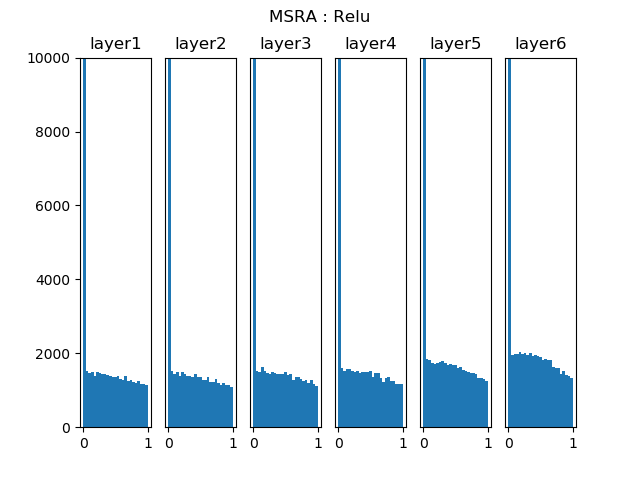 可以看到,随着层的加深,使用ReLU时激活值逐步向0偏向,同样会导致梯度消失问题。于是He Kaiming等人研究出了MSRA初始化法,又叫做He初始化法。