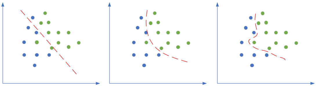 上图中对于“深入敌后”的那颗绿色点样本,正确的做法是把它当作噪音看待,而不要让它对网络产生影响。而对于上例中的欠拟合情况,如果简单的(线性)模型不能很好地完成任务,我们可以考虑使用复杂的(非线性或深度)模型,即加深网络的宽度和深度,提高神经网络的能力。
