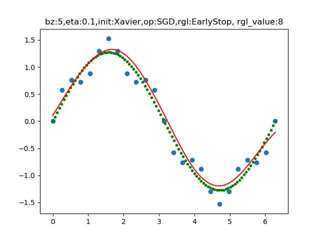 蓝点是样本,绿点是理想的拟合效果,红线是实际的拟合效果。