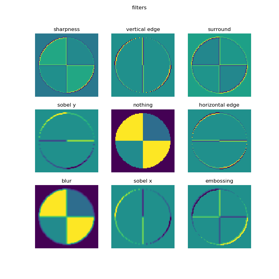 我们先说中间那个图,就是第5个卷积核,叫做"nothing"。为什么叫nothing呢?因为这个卷积核在与原始图片计算后得到的结果,和原始图片一模一样,所以我们看到的图5就是相当于原始图片,放在中间是为了方便和其它卷积核的效果做对比。