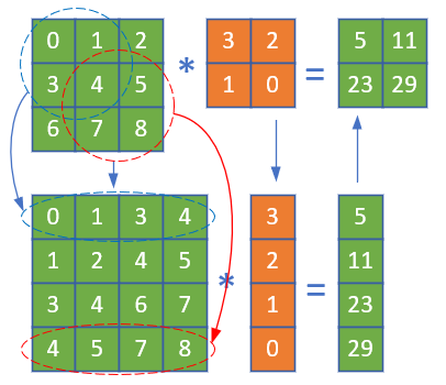 第一步,上半部分中蓝色的虚线圆内的四个元素排列成第1行,形成[0,1,3,4],红色虚线圆内的四个元素排列成第4行[4,5,7,8],中间两行可以从右上角的[1,2,4,5]和左下角的[3,4,6,7]得到。这样,一个3\times 3的矩阵,就转换成了一个4\times 4的矩阵。也就是把卷积核视野中的每个二维2\times 2的数组变成1\times 4的向量。