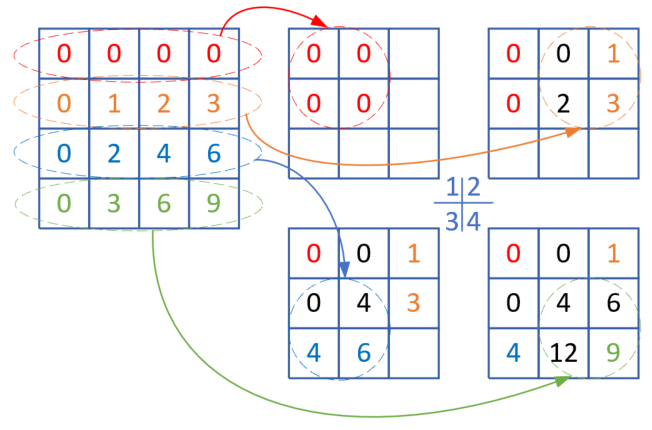 - 在3的基础上,左侧第四行绿色椭圆内的四个元素移到右侧绿色圆形内,其中与原有元素重叠的地方则两个值相加,中间的元素再次加0,还是4;中间靠下的元素原值是6,加6后为12。