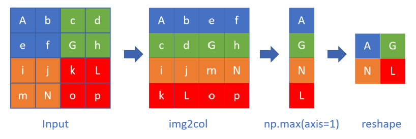 原始数据先做img2col变换,然后做一次np.max(axis=1)的max计算,会大大增加速度,然后把结果reshape成正确的矩阵即可。做一次大矩阵的max计算,比做4次小矩阵计算要快很多。