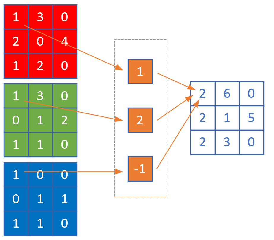 假设有一个三通道的1x1的卷积核,其值为[1,2,-1],则相当于把每个通道的同一位置的像素值乘以卷积核,然后把结果相加,作为输出通道的同一位置的像素值。以左上角的像素点为例: