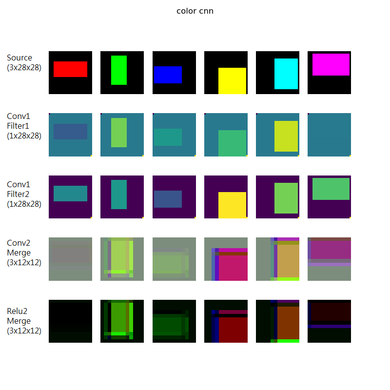 第一行是原始彩色图片,三通道28x28,特意挑出来都是矩形的6种颜色。