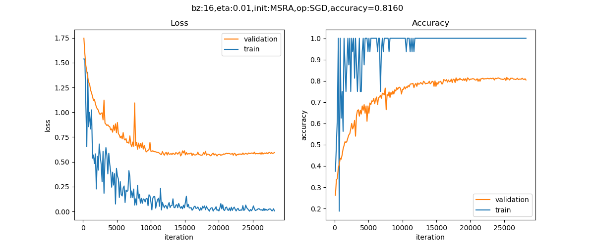 从损失函数曲线可以看到,此网络已经有些轻微的过拟合了,如果重复多次运行训练过程,会得到75%到85%之间的一个准确度值,并不是非常稳定,但偏差也不会太大,这与样本的噪音有很大关系,比如一条很细的红色直线,可能会给训练带来一些不确定因素。