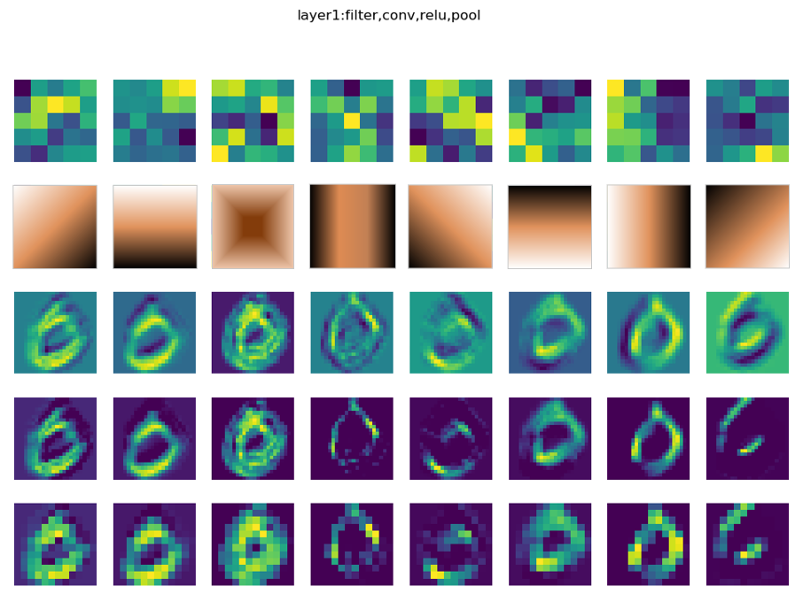 卷积核是5x5的,一共8个卷积核,所以第一行直接展示了卷积核的数值图形化以后的结果,但是由于色块太大,不容易看清楚其具体的模式,那么第二行的模式是如何抽象出来的呢?