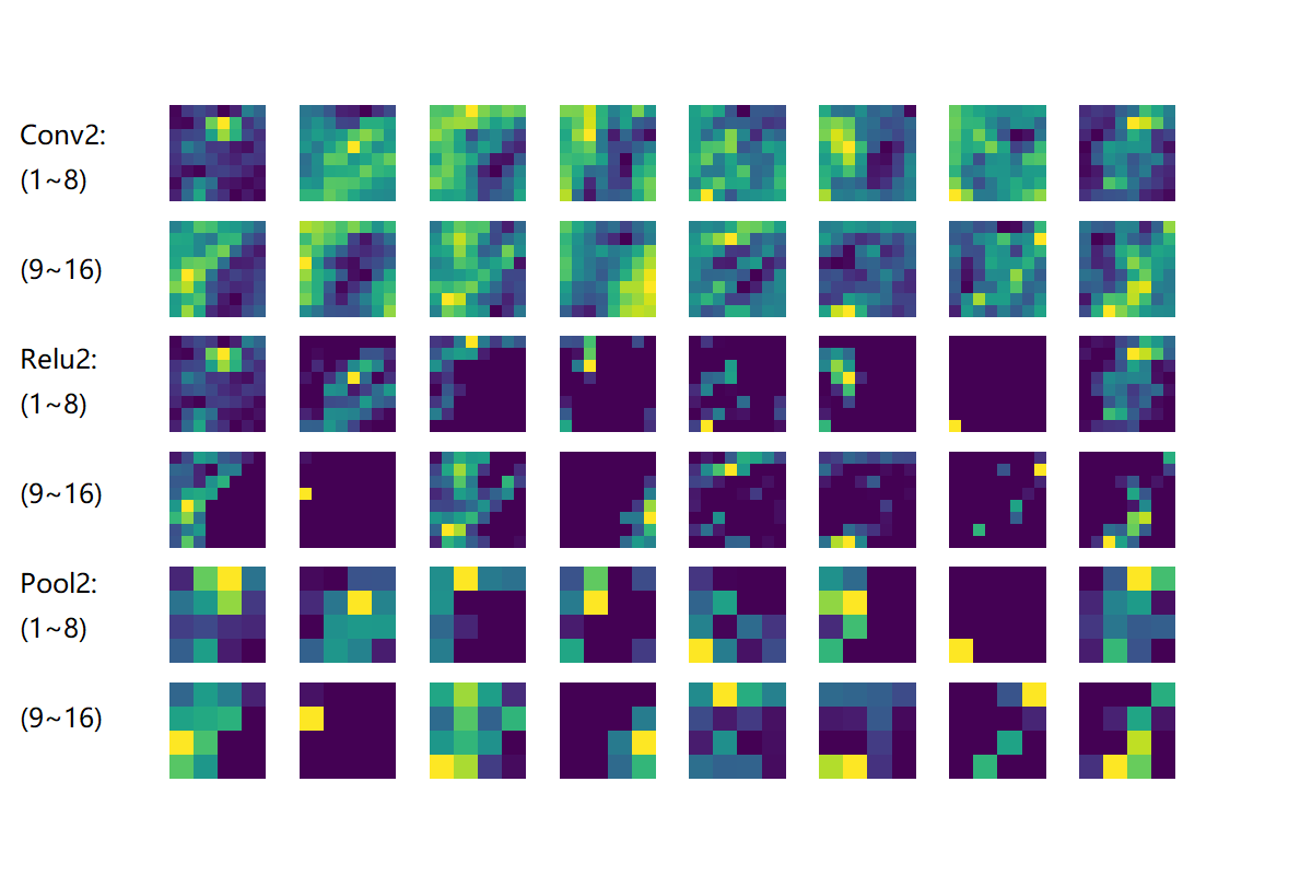 - Relu2:能看出的是如果黑色区域多的话,说明基本没有激活值,此卷积核效果就没用;
