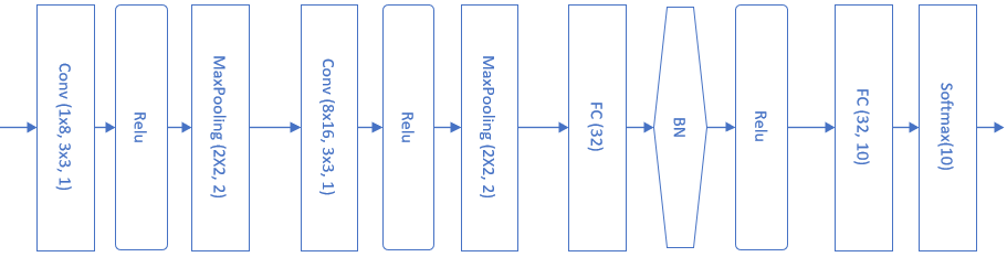 | 激活层 | Relu | 16x8x8 | 16x8x8 | |