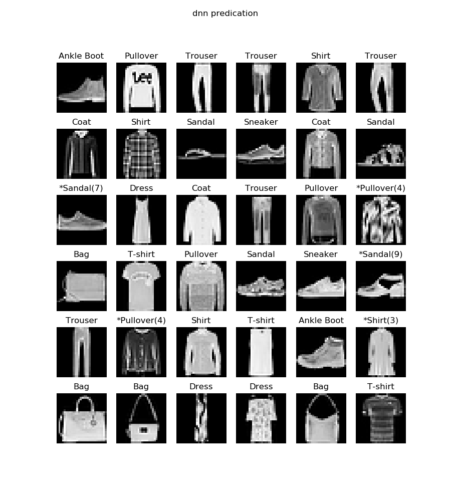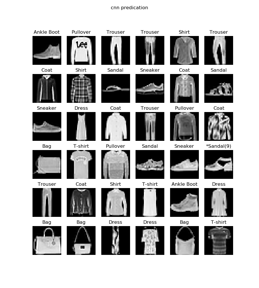 凡是类别名字前面带*号的,表示预测错误,比如第3行第1列,本来应该是第7类“运动鞋”,却被预测成了“凉鞋”。