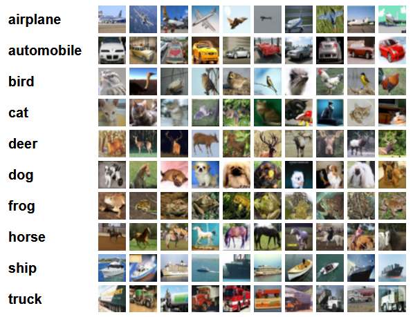 Cifar-10 是由 Hinton 的学生 Alex Krizhevsky、Ilya Sutskever 收集的一个用于普适物体识别的数据集。